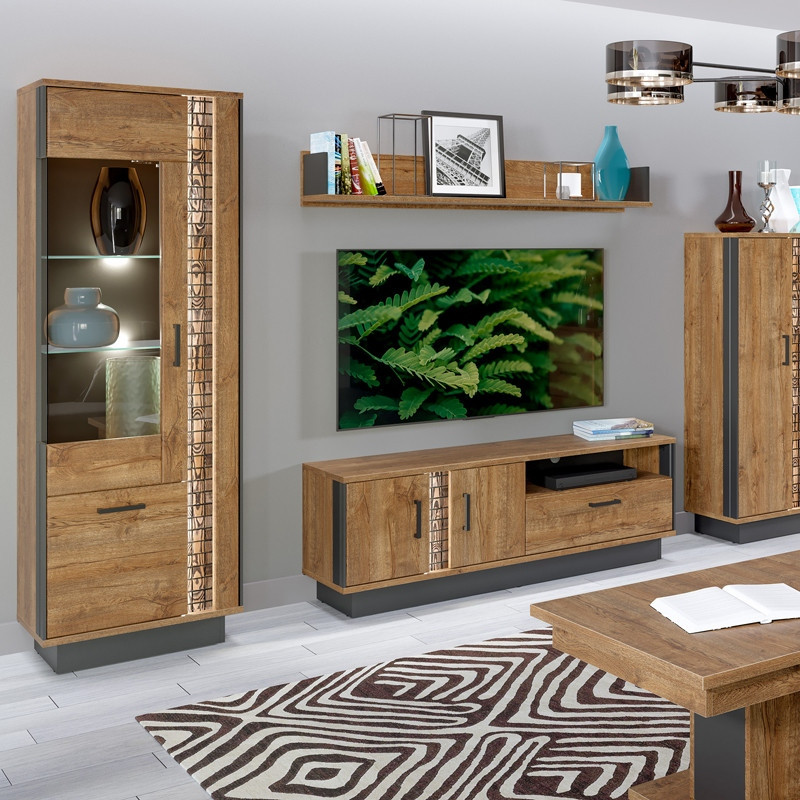 Crafted from high-quality laminated wood and MDF, the DORIAN cabinet is finished in a stunning April oak colour with sleek black inserts. It also features smoked tempered glass doors, adding a refined and modern touch to your home while allowing you to display your favourite décor and valuables in style.
