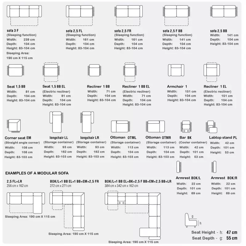 - Colors and Materials: Available in a variety of colors, premium fabrics, and 100% genuine leather.