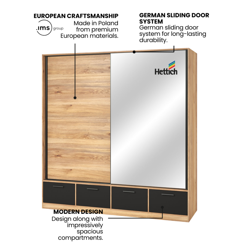 Inside, the wardrobe is designed for maximum organization. The German-engineered Hettich TOP Line L sliding system ensures smooth and silent operation for long-term use.