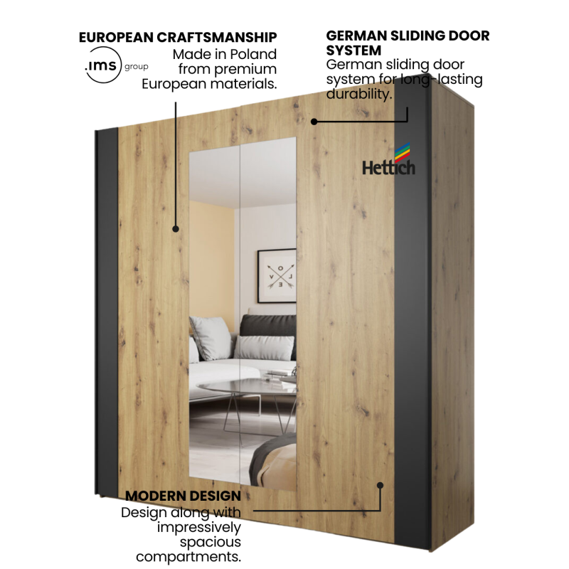 • Finish: Stylish Oak & Black with full-length mirrored sliding doors