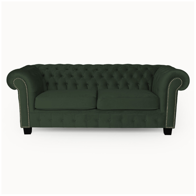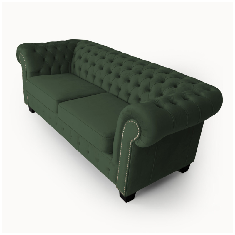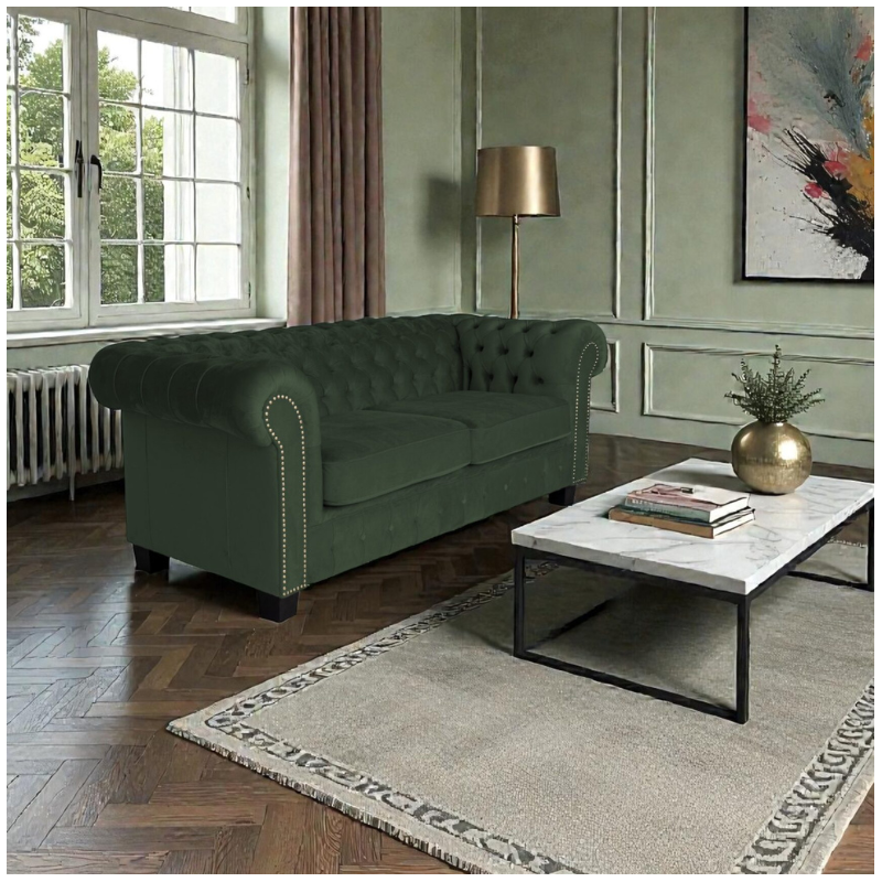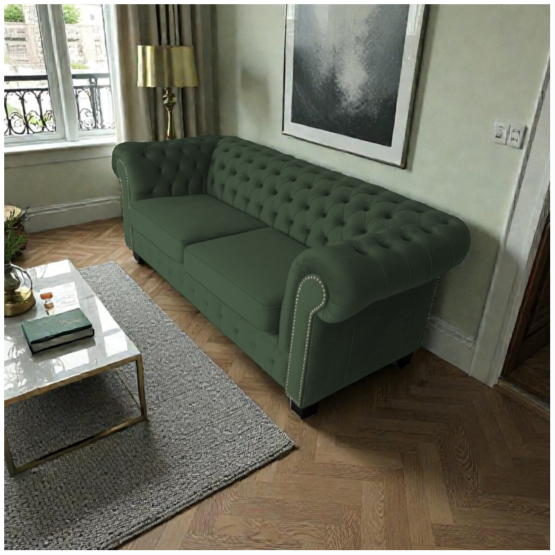 Green upholstery is a popular choice for customers seeking a bold yet elegant Chesterfield sofa look. We offer shades ranging from soft sage green to deep emerald green, available in luxurious velvet and premium fabric options.