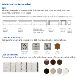 The Lord Sofa Range is fully customizable to suit your unique preferences. Choose from a wide range of colors, fabrics, or leather to design a sofa that complements your home decor. Whether you prefer a 4-seater sofa, 3-seater sofa bed, or an armchair, the Lord range has options for every space.