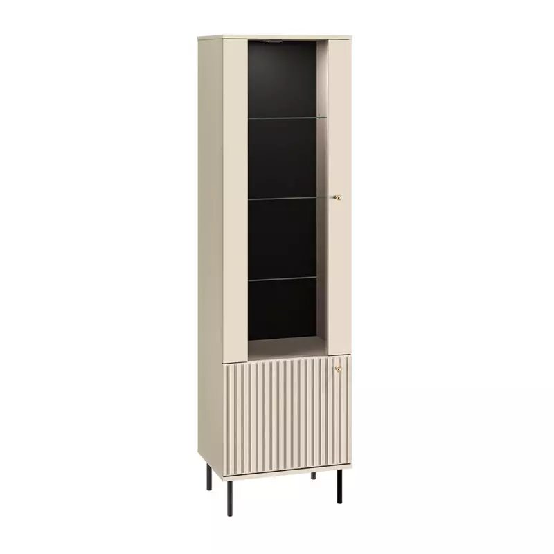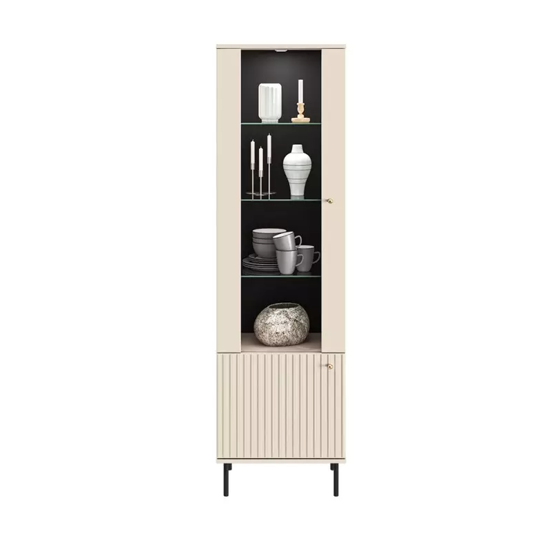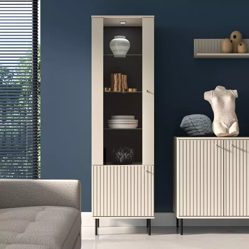 The Tall Display Cabinet is a sophisticated blend of luxurious cashmere décor and milled MDF fronts, perfect for enhancing contemporary interiors. Crafted from high-quality laminated board, this exclusive display cabinet seamlessly combines aesthetics with durability and functionality, offering both style and practicality for your home.