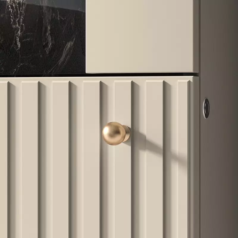 - Elegant Cashmere Finish: Featuring refined MDF fronts with a soft cashmere tone and decorative milled lamellas, adding a luxurious touch to your living space.