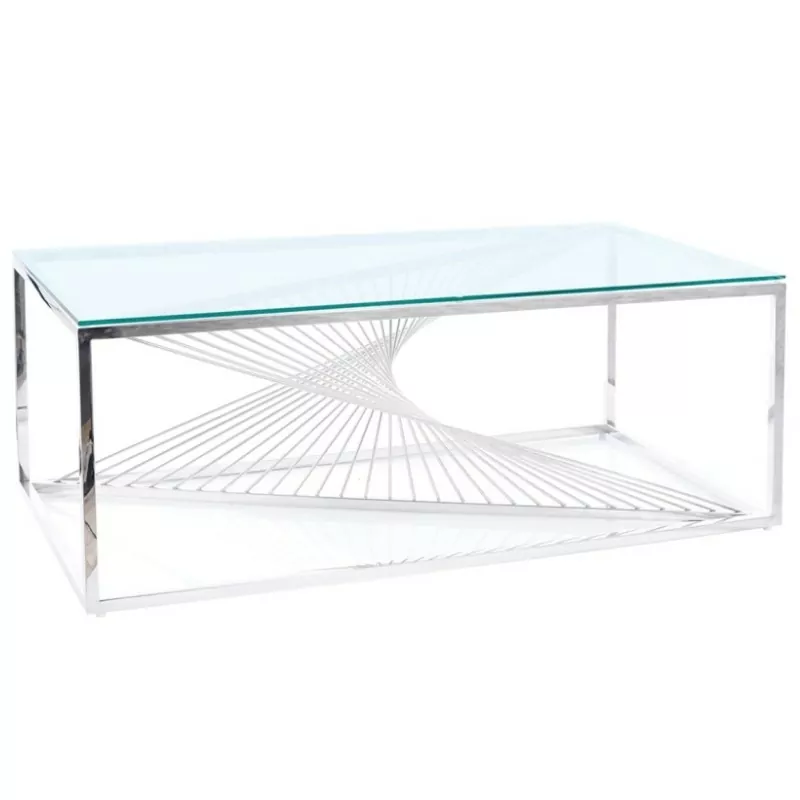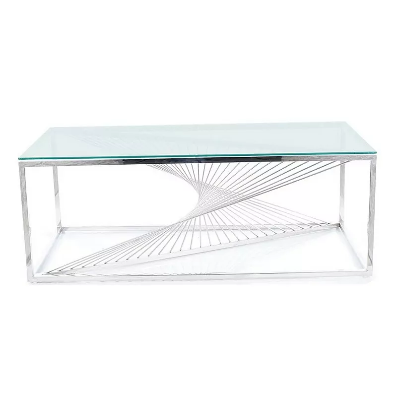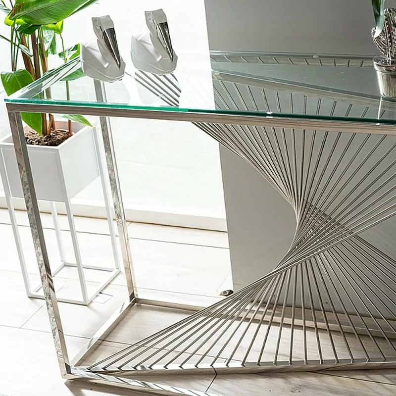 The base is constructed from silver-colored stainless steel, featuring four straight legs that extend from the tabletop and connect with a metal rectangle at the bottom. Below the glass surface, an artistic metal composition reminiscent of twisted scaffolding adds an original and aesthetic touch to this exquisite design.