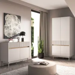 The Vertina wardrobe features a sleek Oak and Beige finish that complements contemporary interiors, creating a calm and inviting bedroom atmosphere. Its minimalist design, clean lines, and smooth doors make it a perfect fit for modern homes. Designed to save floor space, this wardrobe is ideal for small rooms or minimalist interiors common in Irish apartments and houses.