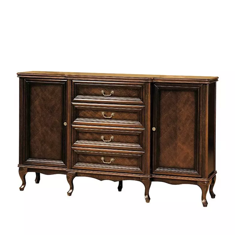 Upgrade your interior with this stunning wooden chest of drawers, part of the timeless Wersal furniture collection. Featuring two doors and four spacious drawers, this piece is beautifully finished in solid dark heartwood wedge and enhanced with ornate brass handles. A perfect blend of elegance and functionality for any modern or classic home.